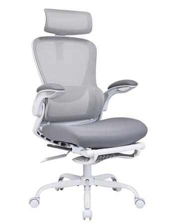 Ergonomikus irodai forgószék állítható fejtámlával, hálós háttámlával és lábtartóval, amely kényelmes, gerincbarát üléshez készült napi használatra.