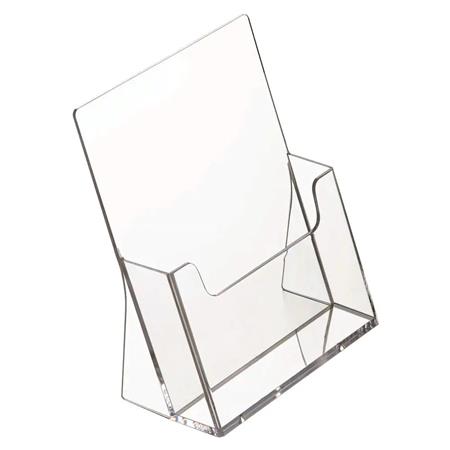 Az A5 méretű asztali szórólaptartó praktikus és esztétikus megoldás prospektusok, katalógusok és egyéb információs anyagok kihelyezésére.